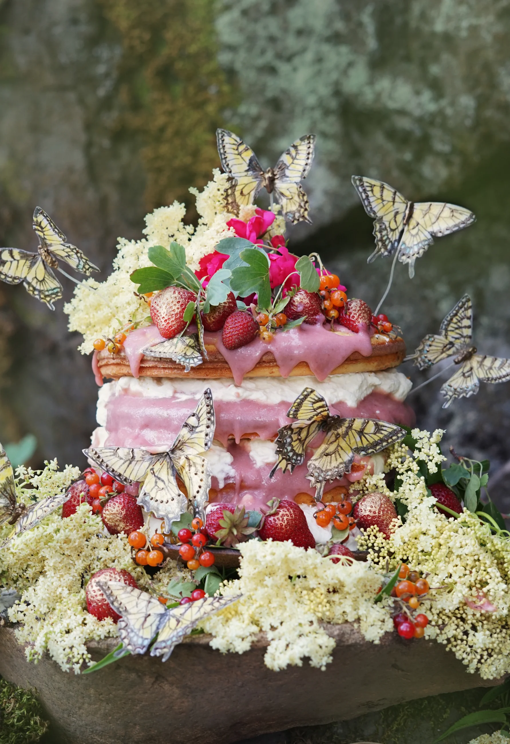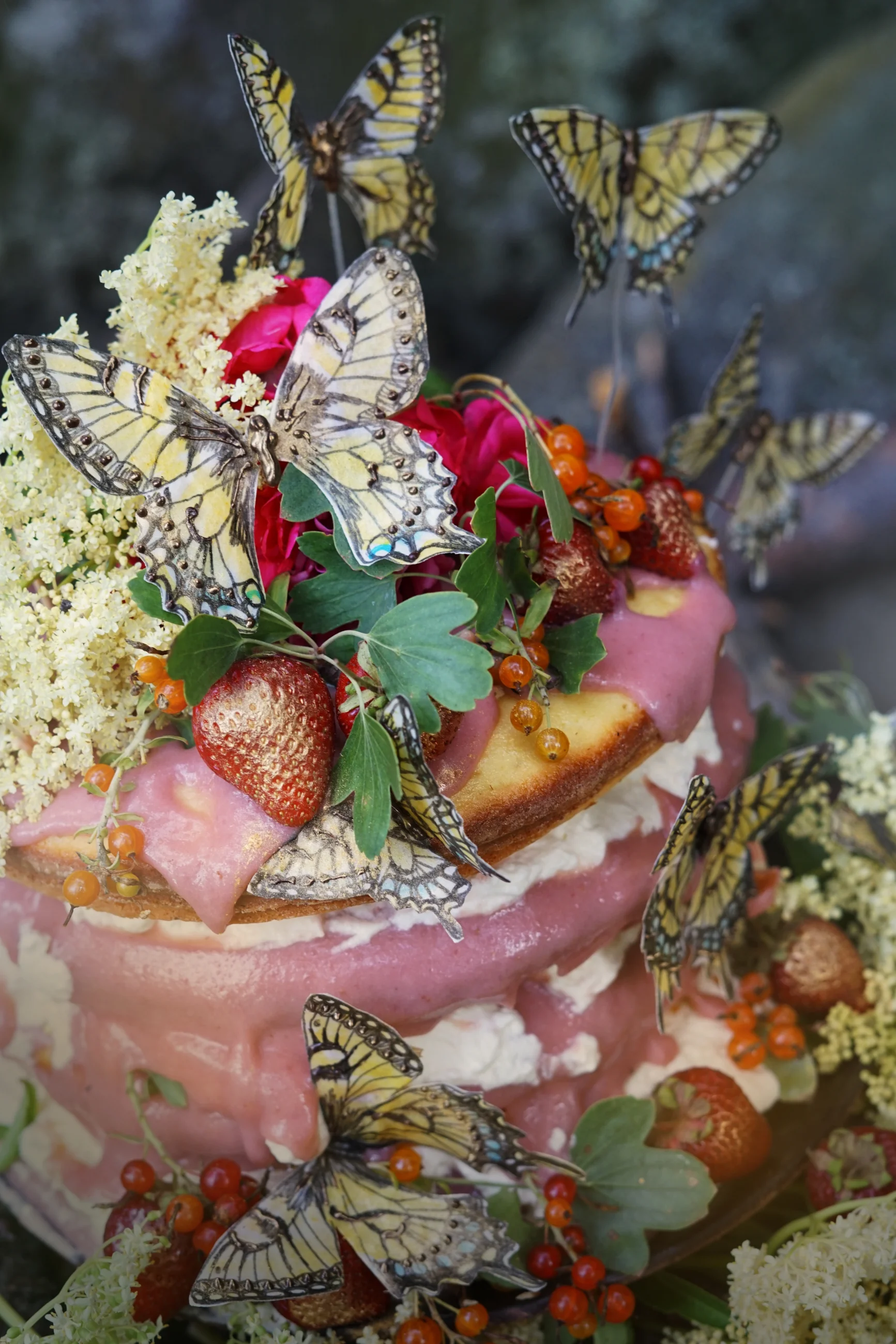 If there is one plant that, to me, represents those ethereal spaces-and-times-between, it’s elderflower. The scent of elderflower blossoms is unlike any other smell: floral, uplifting, utterly bewitching. I’ve always thought that if one was looking for an entrance into the fairy realms, an elderflower bush on a midsummer night would be a pretty good place to begin. This cake is a celebration of those spaces between: the glowing sunsets, the strange dreams, and those invitations to the fairy realms. Fluffy elderflower cake is sandwiched between layers of rich tart rhubarb curd, strawberry jam, and elderflower whipped cream, then topped with edible butterflies and lots of fresh fruit and edible flowers. I have it on good authority that this cake can take you places.