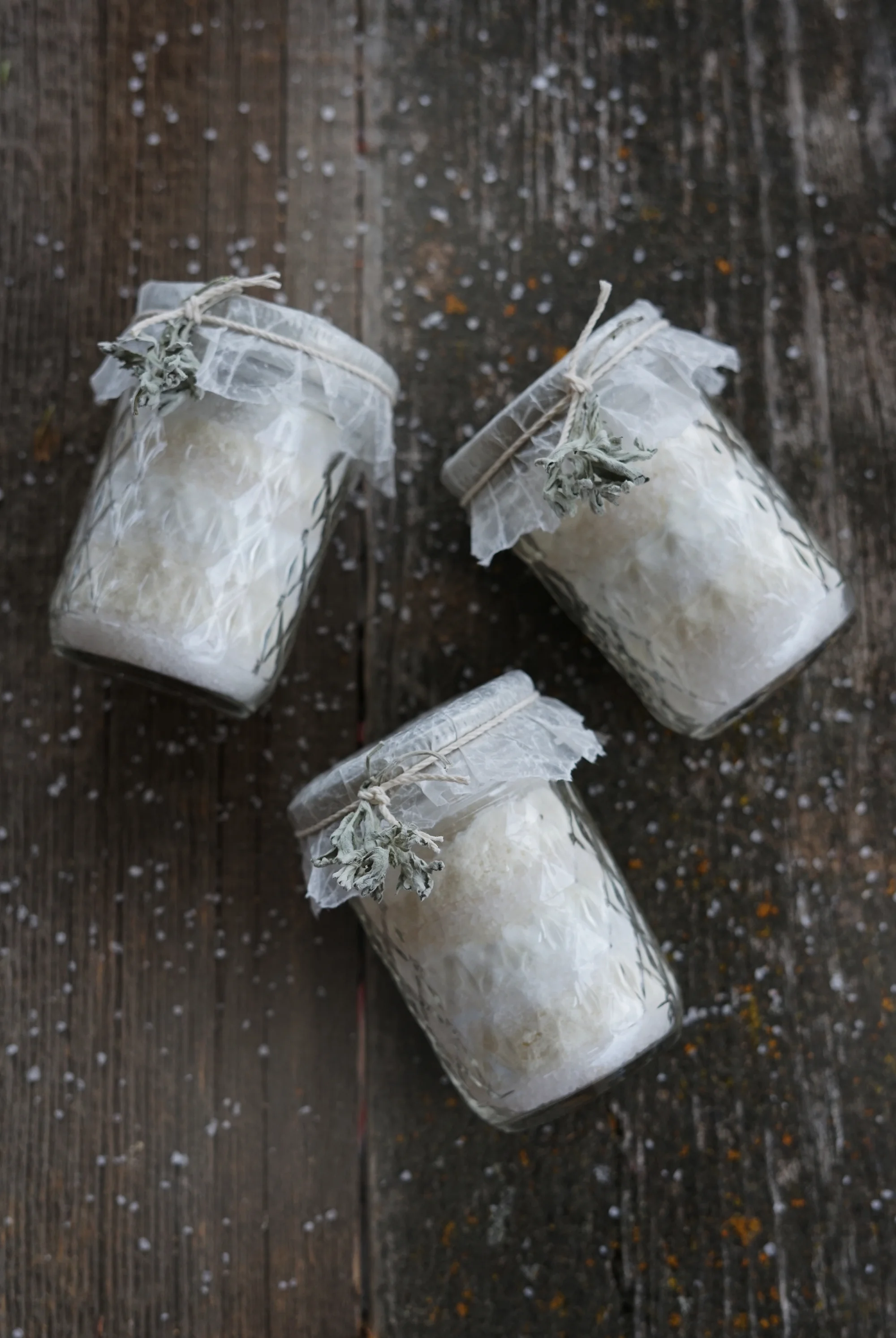 I used coconut milk powder both for its luxurious texture and sweet fragrance and because I am allergic to dairy. You could certainly substitute whole milk powder instead, though. The scent combination holds the sweetness of this time of year as well: birch sap just beginning to flow with its sweet scent, plenty of balsam fir needle reminiscent of the conifers that hold our attention in the winter, and a base of sweet orange to balance it all out and provide and uplifting and cheerful counterpoint to the blend. (Sweet orange and conifer has become my favorite combination since my massage therapist started using it for my treatments. I find it so uplifting!) Baking soda, sea salt, and epsom salt work together to relax, soften, and soothe tired muscles. Together, all of these ingredients work in harmony to create a jar perfect for gift giving and a bath that’s perfect for relaxing.